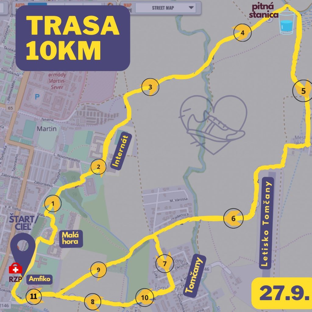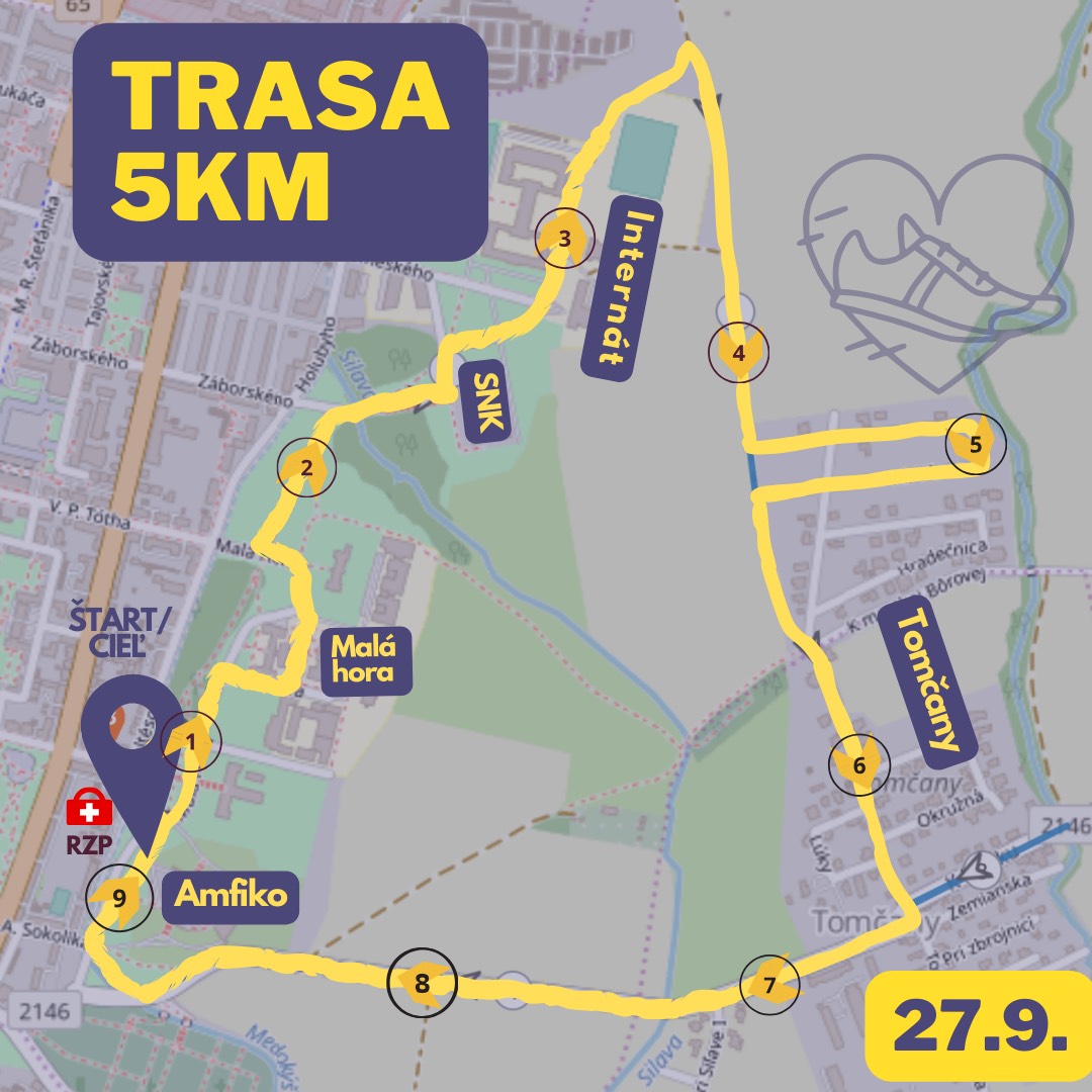 Trasa sa začína pri Amfiku. Povedie okolo dekanátu Jesseniovej lekárskej fakulty, Slovenskej národnej knižnice, horného vysokoškolského internátu a futbalového ihriska. Následne odbočíte na poľnú cestu, kde vás čaká kríženie potoka, pitná stanica a malinové sady. Ďalej sa pobeží mestskou bôrovou, cez Tomčany, po cyklotrase a do cieľa.